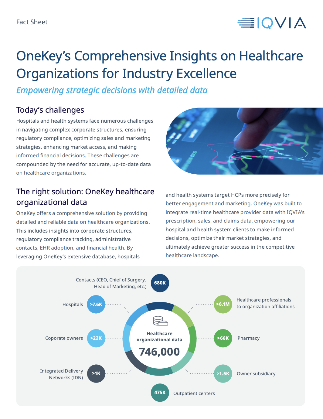 Discover how IQVIA’s OneKey delivers unmatched healthcare organizational data to help hospitals and health systems navigate complex corporate structures, optimize marketing and sales strategies, and make informed financial decisions. OneKey integrates real-time provider data with prescription, sales, and claims data to support smarter, data-driven decisions.