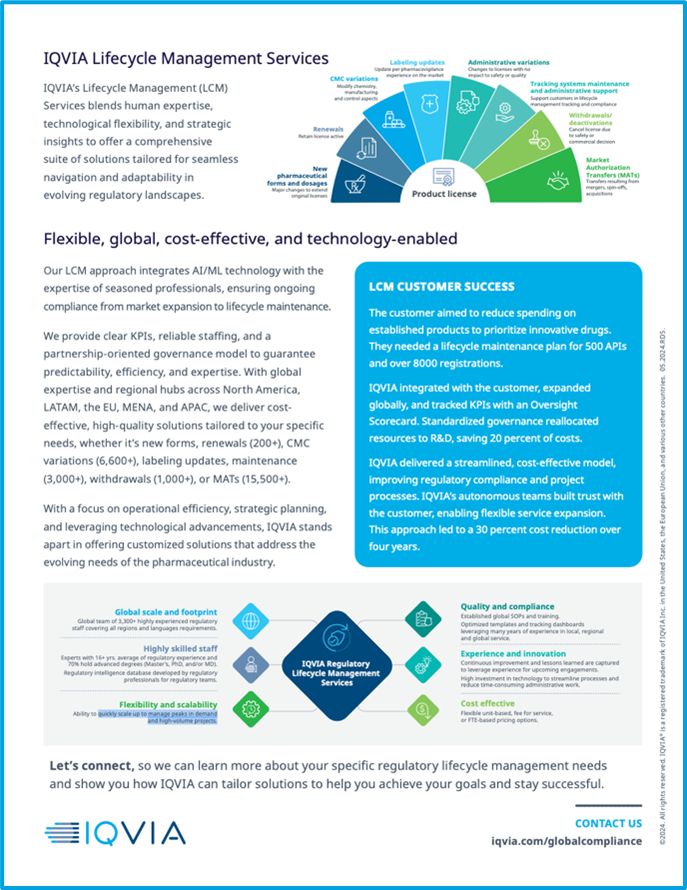 Balance new product development to drive growth while managing regulatory compliance of mature products, with IQVIA’s Lifecycle ManagementServices. Benefits include: